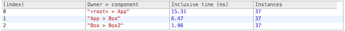 Perf.stop()Start/stop đo lường. Các hoạt động React ở giữa được ghi lại cho các phân tích bên dưới. Các thao tác chiếm một lượng thời gian không đáng kể sẽ bị bỏ qua.